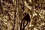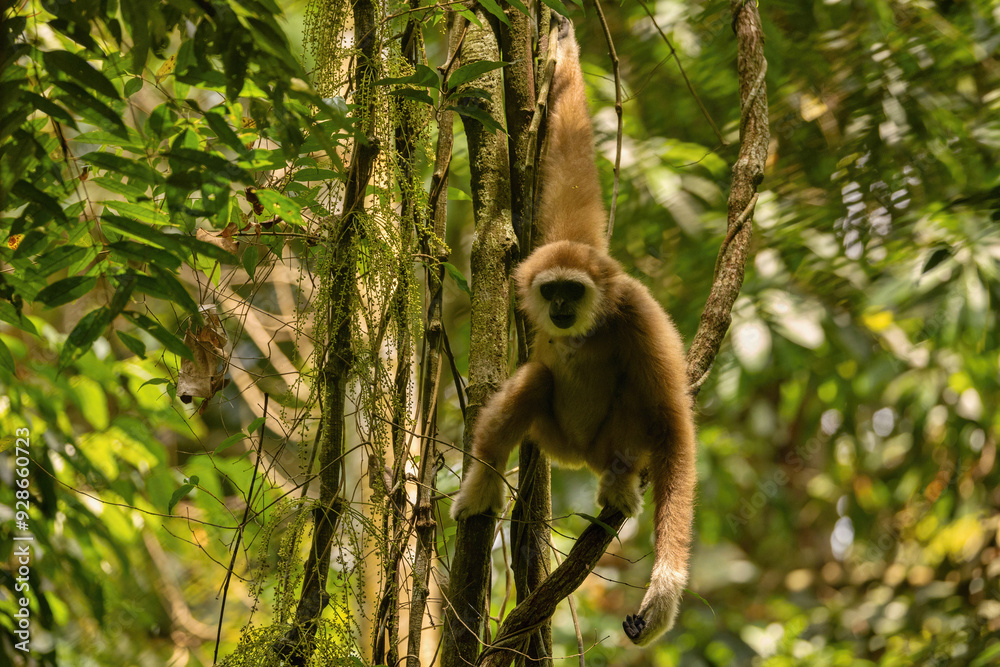 Sumatran lar gibbon in the nature habitat, also known as the Sumatran white-handed gibbon, is a subspecies of the lar gibbon, a primate in the gibbon family Hylobatidae. Hylobates lar vestitus.