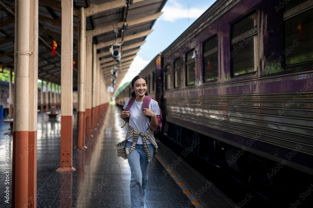 A woman is running to catch a train at a train station