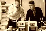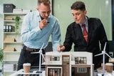 Caucasian middle-aged businessman and an Italian accountant at desk with a monitor, discussing the latest innovations in renewable energy, wind turbines, solar cells, sustainable city planning.