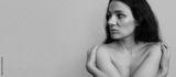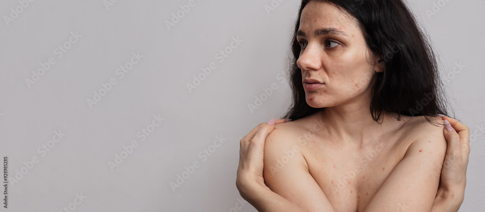 Close-up of a young woman with acne on her face and skin problems. A panoramic shot on the banner. a place for your text