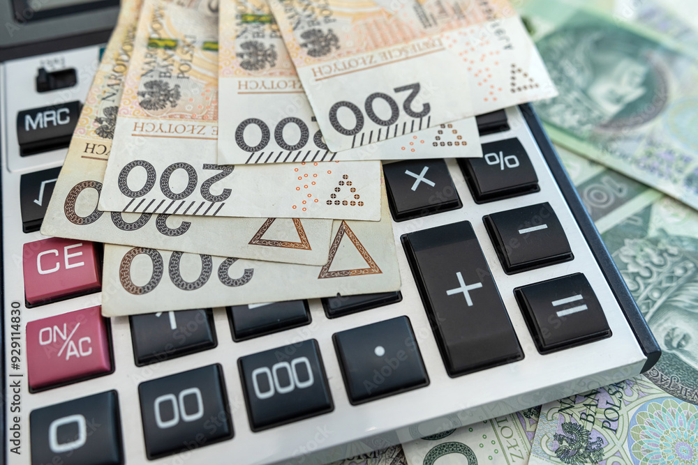 polish zloty money banknotes with calculator. 200 100 pln bills business concept