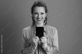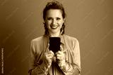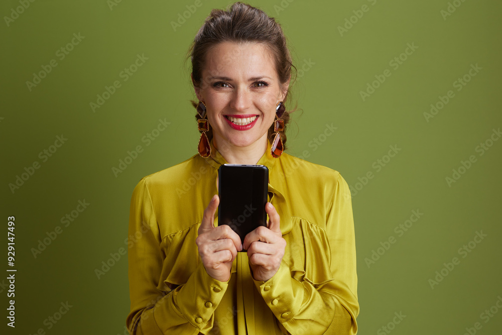 smiling trendy woman using smartphone isolated on green