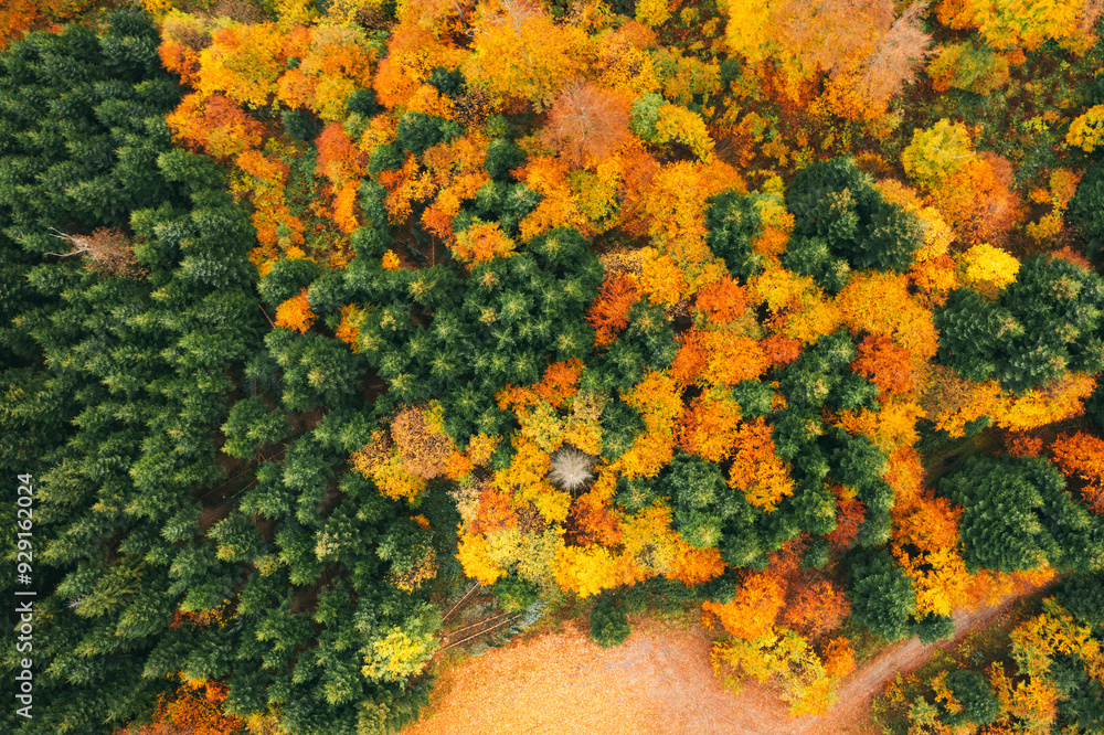 Colourful autumn forest form above, captured with a drone. Natural seasonal landscape background.