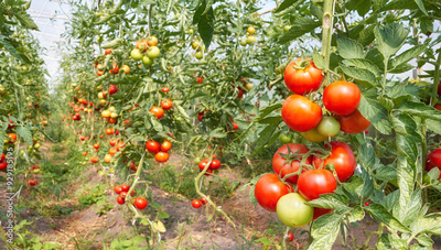 Organic tomatoes in a greenhouse, selective focus.