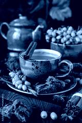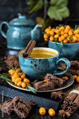 Ceramic cup with healing tea with sea-buckthorn on wooden background
