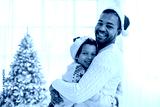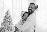 african american teenage boy in santa hat hugs dad at home for christmas, man wishes son happy new year and celebrates together
