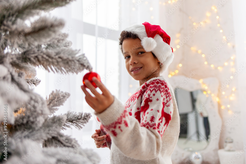 african american teenage boy in santa hat and winter warm sweater decorates christmas tree with red ball at home, child celebrates new year and christmas and holds toy decoration