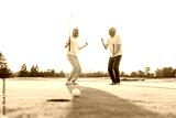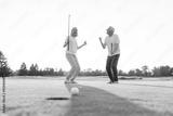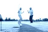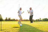 couple of elderly seniors in uniform playing golf on the course and celebrating victory at sunset, old man and woman hitting a golf ball into a hole and rejoicing in success together outdoors