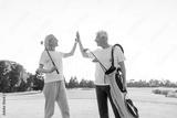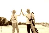 elderly senior couple in uniform celebrating victory and success in golf game and giving high five, old man and woman playing golf on golf course at sunset and doing outdoor sports
