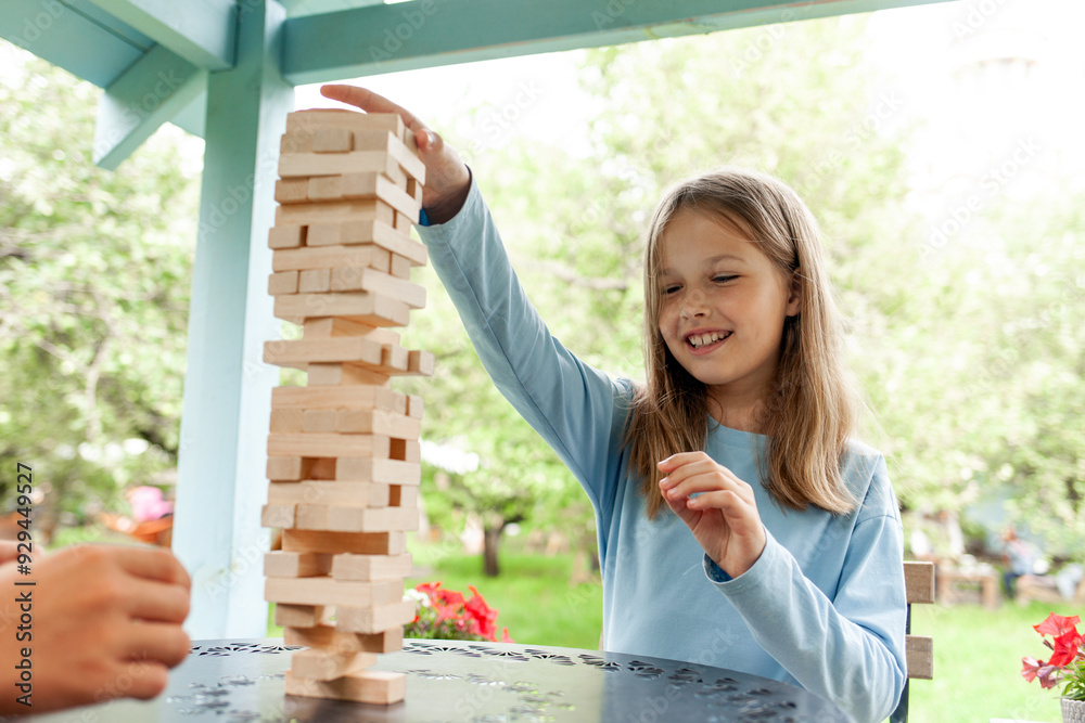 Teenage girl with smile on face carefully adding block to tall tower of wooden blocks while playing in gazebo with friend