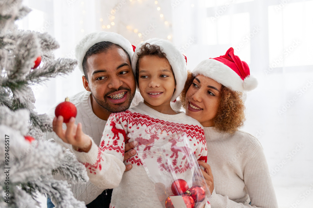 African American family in Santa hat celebrate New Year together at home and decorate Christmas tree, teenage boy celebrates New Year with mom and dad and holds red toy