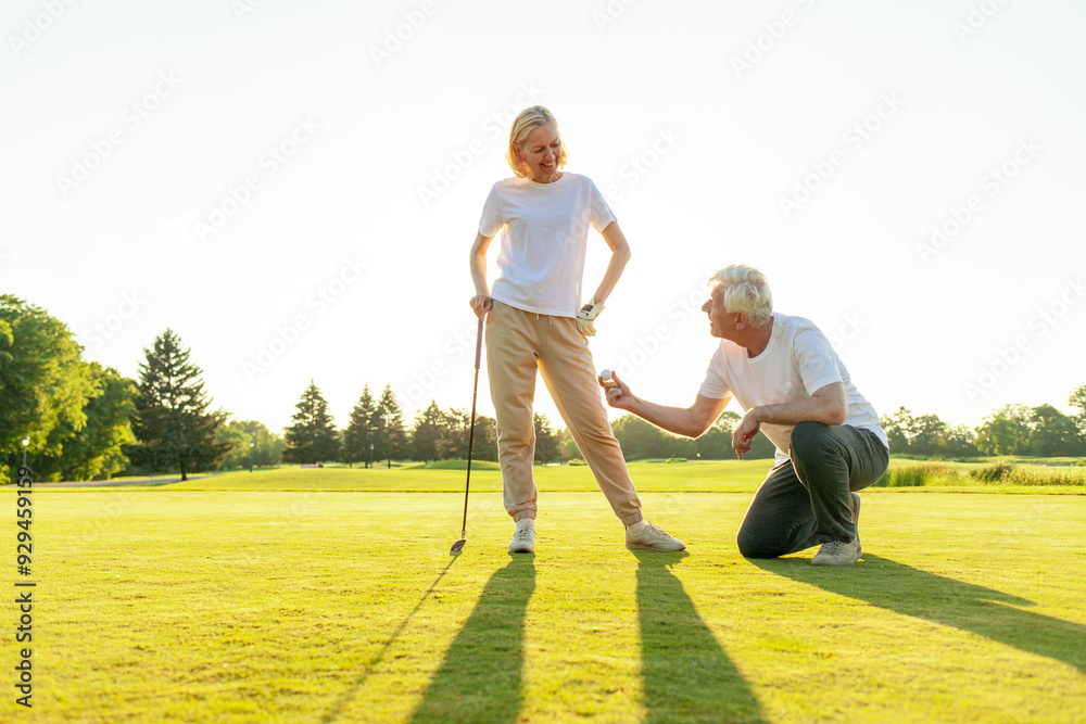 elderly senior couple in uniform playing golf on golf course at sunset, old man instructor teaching woman how to hold golf club and swing ball, grandfather helping grandmother play outdoors