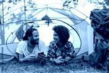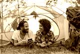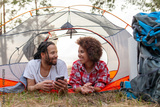 young african american couple on hike sitting and using smartphone in tent near lake in nature, man and woman tourists looking at mobile phone online on picnic trip and chatting