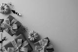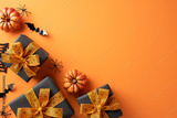 Halloween-themed presents with orange ribbons, pumpkins, bats, and spiders arranged on an orange background, perfect for holiday decorations and spooky festivities