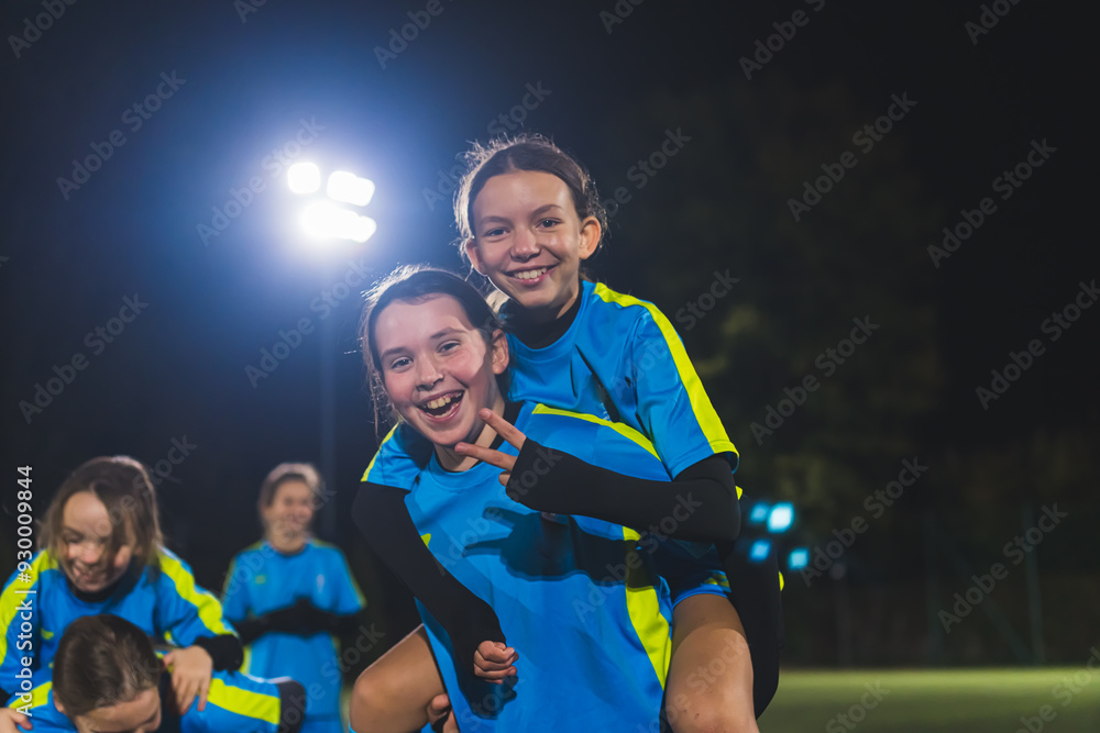 cheerful football player girl carrying her teammate with her back, girls soccer team celebrating victory. High quality photo