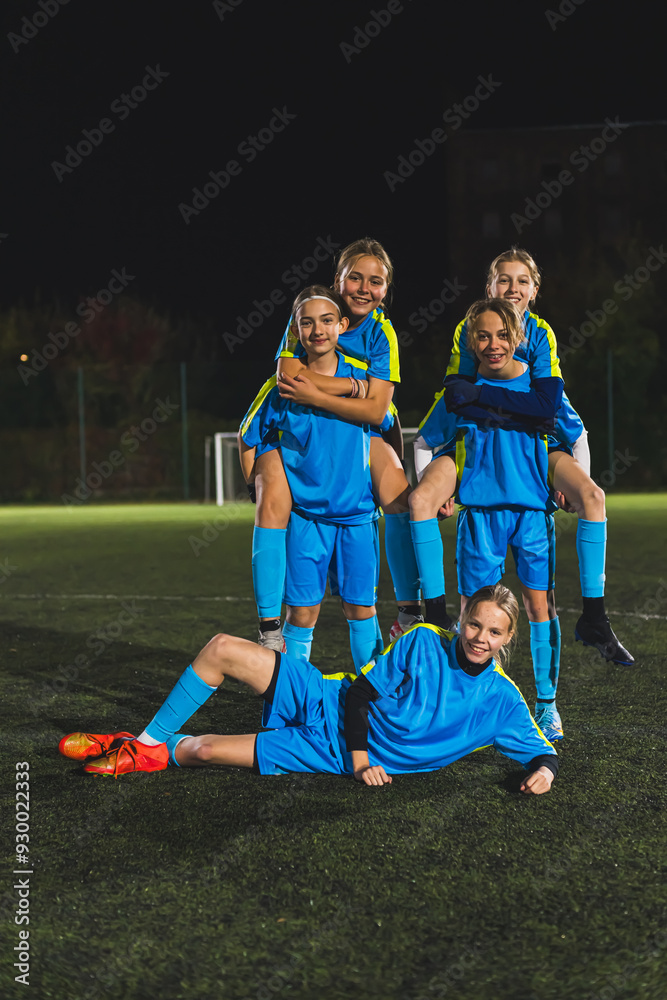 vertical shot of several young football player girls in blue uniforms posing for the camera, teamwork concept. High quality photo