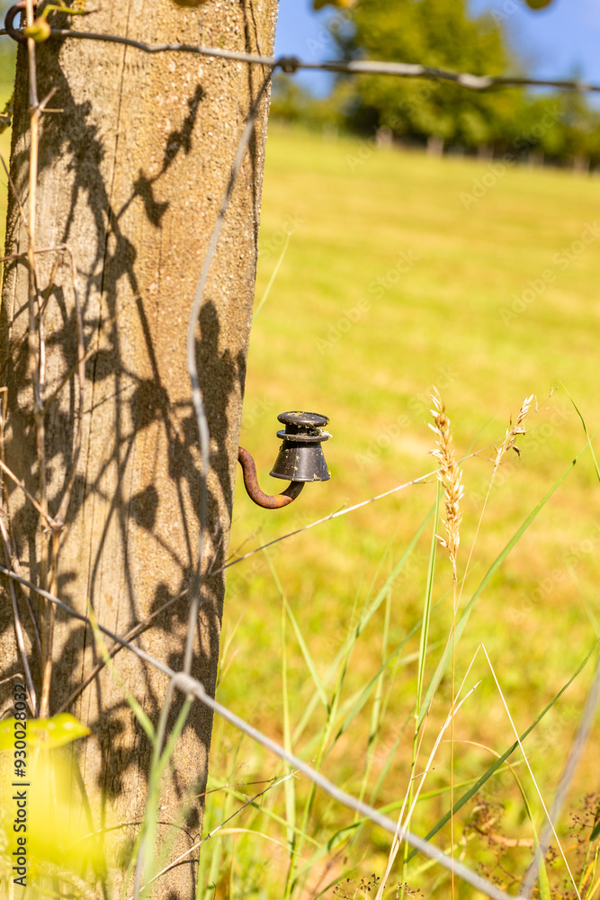 Rustykalny Krajobraz z Drewnianym Słupkiem i Drutem Kolczastym – Symbol Wiejskiego Spokoju i Tradycyjnych Ogrodzeń. Pola uprawne w Niemczech na Bawarii.