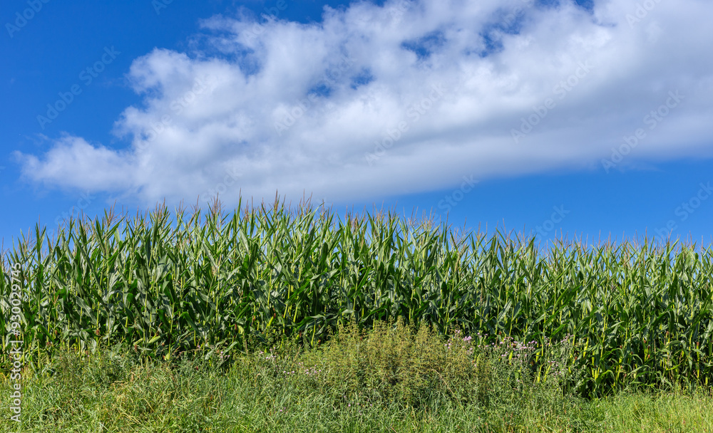 Rozległe Pole Kukurydzy pod Błękitnym Niebem – Symbol Obfitości i Plonów Wiejskiego Rolnictwa. Idealna Sceneria Lata z Soczyście Zielonymi Łanami Roślin. Doskonała Reprezentacja Zdrowego, Zrównoważone