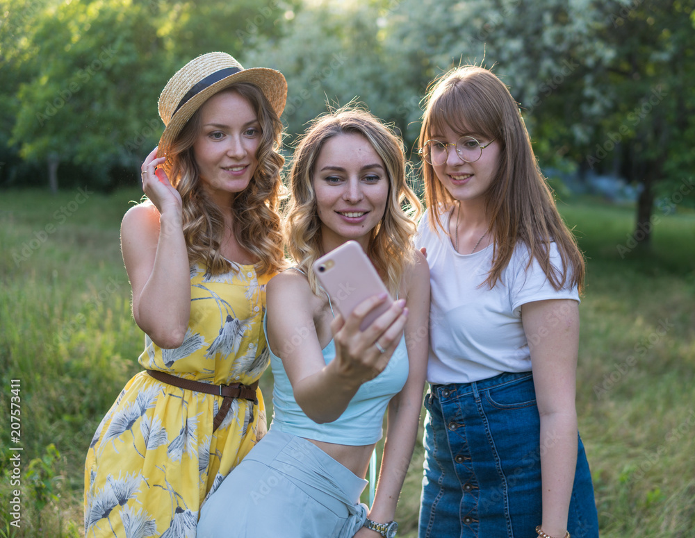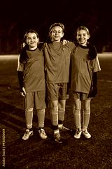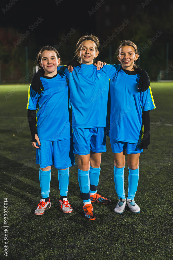 football team's three member girls posing in a stadium, full shot, teamwork concept. High quality photo