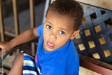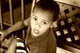 African village , curly boy poverty sitting on the bench in front of the door burglar bars at home