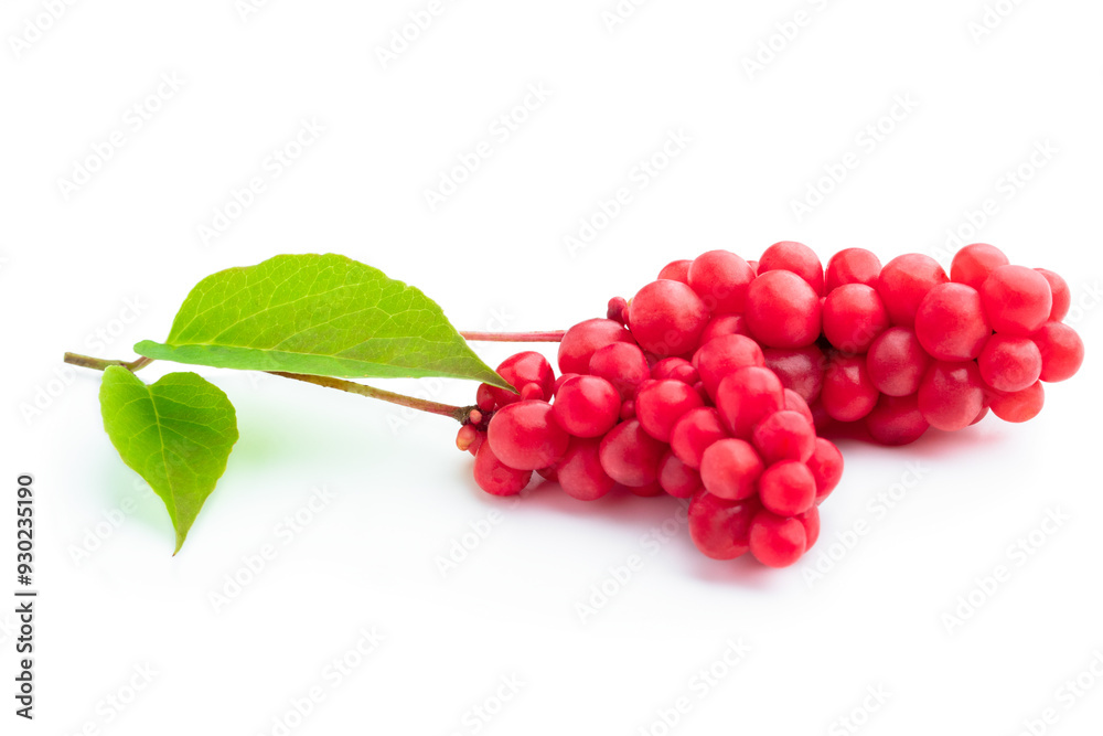 Schisandra chinensis medicinal herb fruit with leaf isolated on white