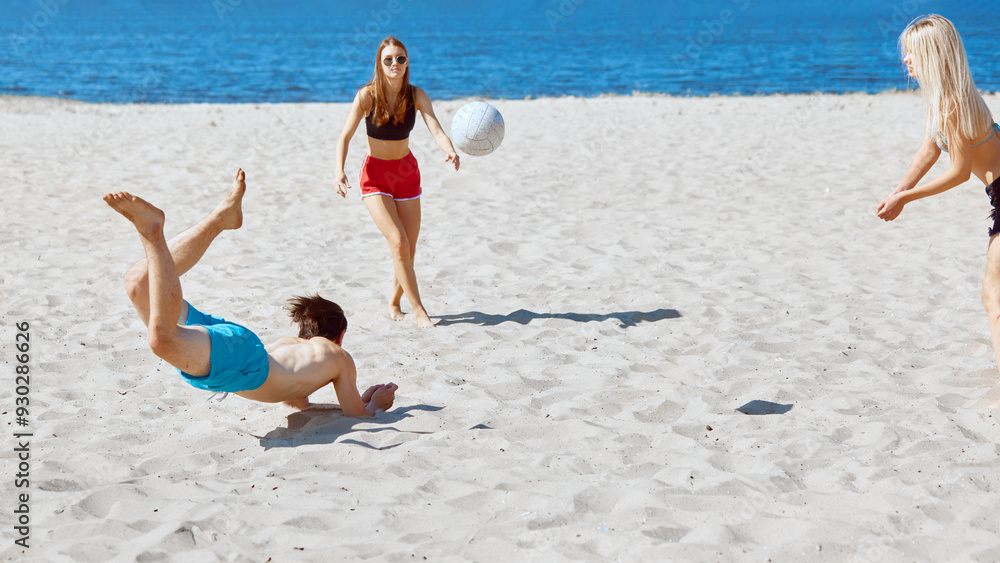 Dynamic game. Young people, friends spending sunny day by the river, playing beach volleyball with fun and enthusiasm. Concept of sport, summer activity, leisure games, friendship