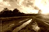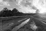 Landscape view of gravel road in countryside with meadow at sunset.