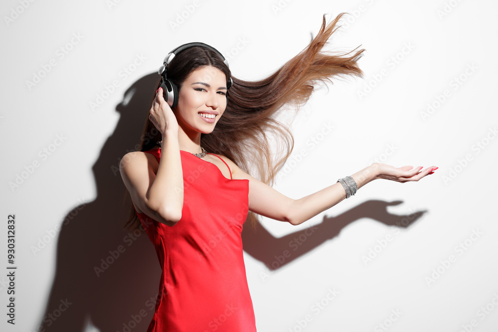 A young woman in a vibrant red dress loses herself in music, dancing with headphones on, showcasing a sense of freedom and joy in a studio setting.