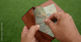 Man hands opens brown money wallet, He counts Thai baht banknote money in garden around house.