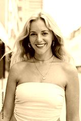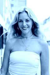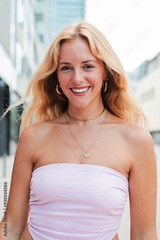 Vertical individual portrait of a smiling teenage Caucasian girl outdoors looking directly at the camera. One friendly blonde female gazing at the viewer. Young adult woman facing forward and laughing