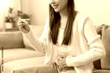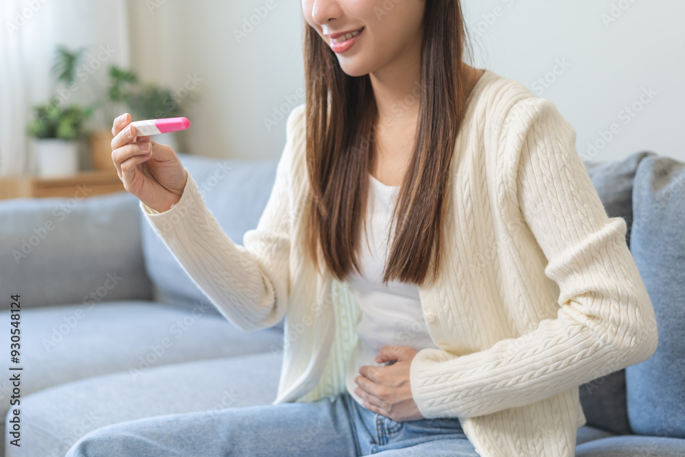 Happy thankful asian young woman hand holding pregnancy test after result with positive, surprised glad girl sitting on couch living room at home. Pregnant of ovulation fertility, motherhood concept.