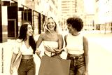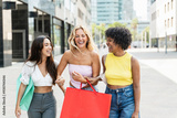 Three girls shopping and walking in the city in summer vacations. Cheerful multiracial women having fun in the weekend