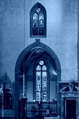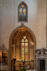 Florence, Italy - Aug 19, 2021: Interior view of Santa Croce Basilica showcasing Gothic arches and stained glass windows