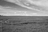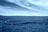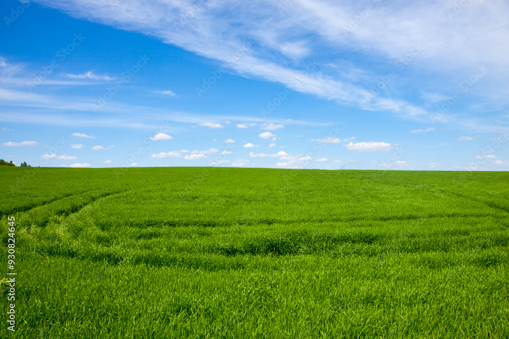 Bright green field and blue spring sky with clouds. Fresh thick grass. Countryside landscape.