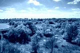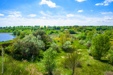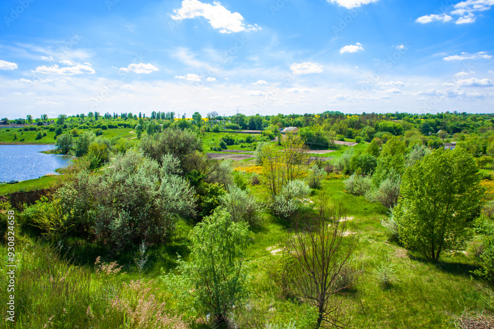 Spring trees, meadows, lake and bright blue sky with clouds. Rural landscape.