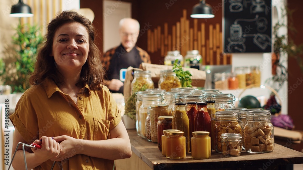 Portrait of smiling woman in eco friendly zero waste supermarket using shopping basket to purchase bulk items in ecological glass containers. Client in local grocery shop buying chemicals free food