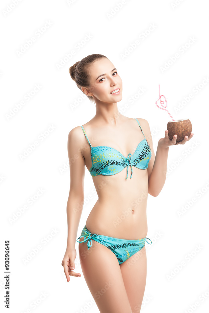 Young beautiful summer girl drinking fresh coconut juice from a straw