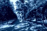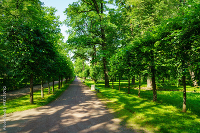 A dirt path through a park with lush green trees during the daytime in summer.
