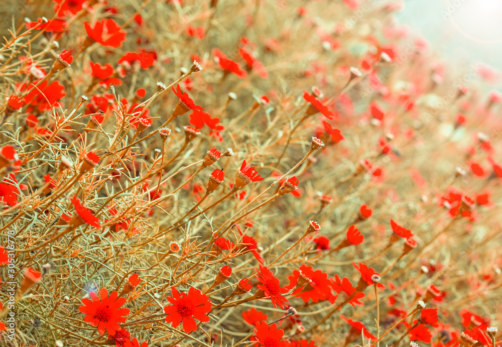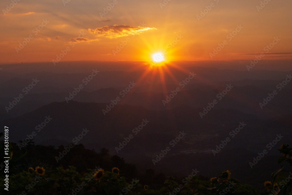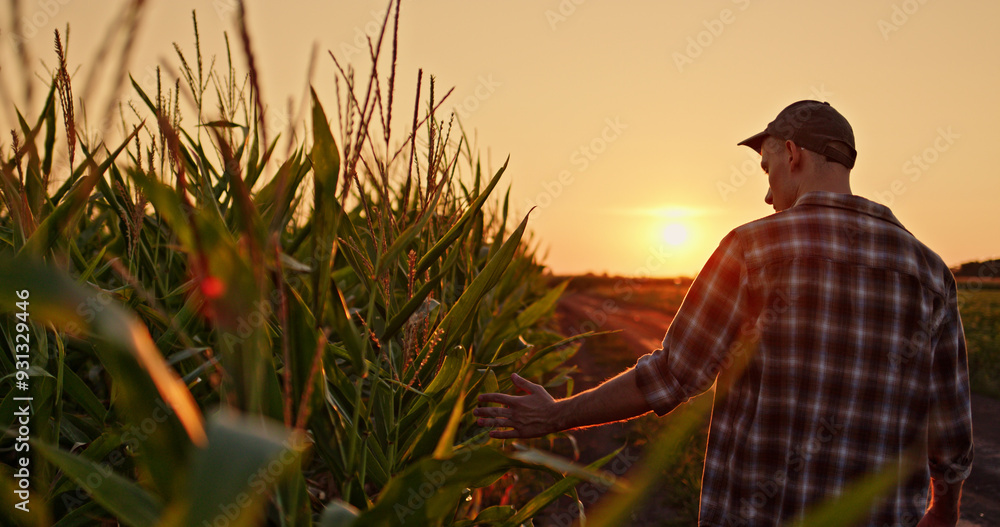 A successful farmer walks along his cornfield, touching the leaves, with the sunset visible in the sky.
