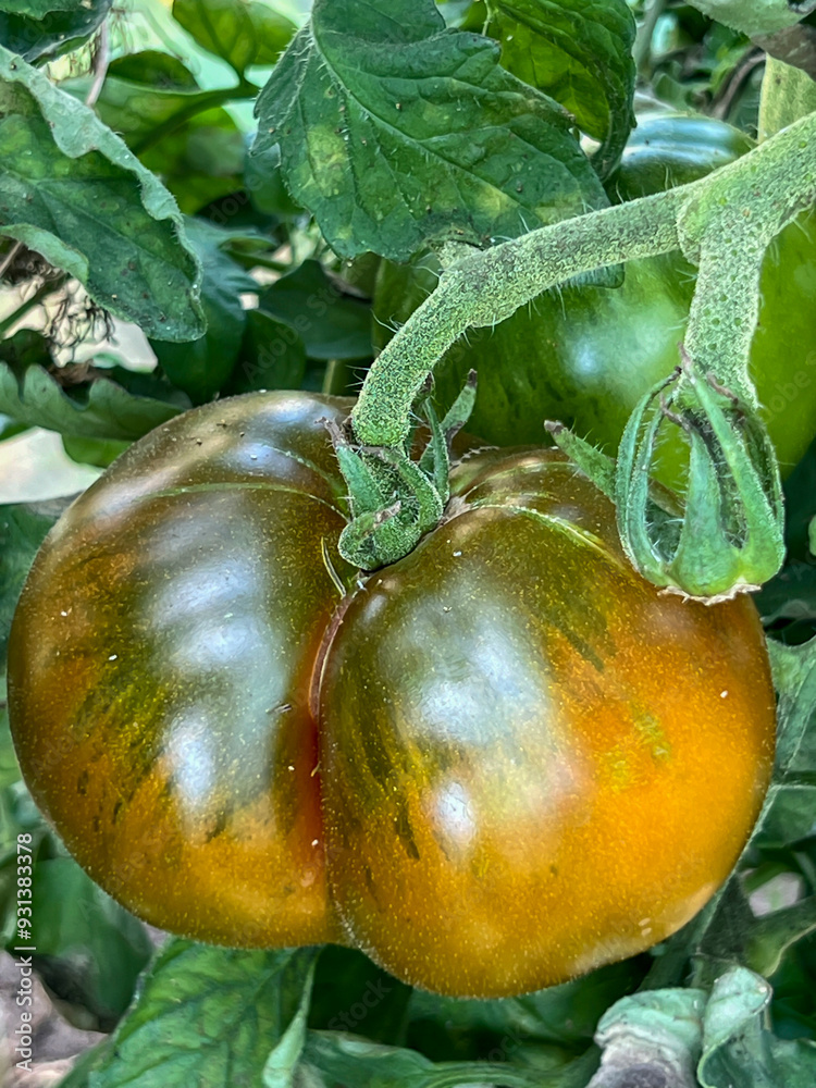 Growing tomatoes in a garden at home under a plastic tent. Unripe green tomatoes on the bush close-up
