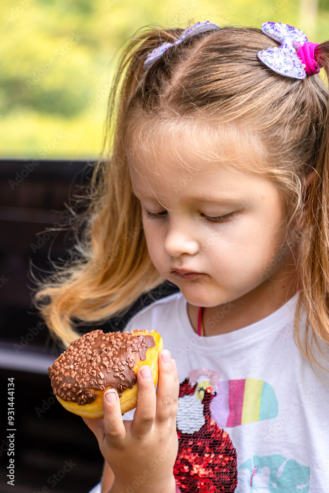 Little blonde girl eating chocolate donut. junk food, sweetness, children's joy.