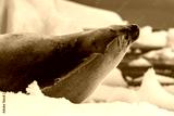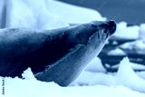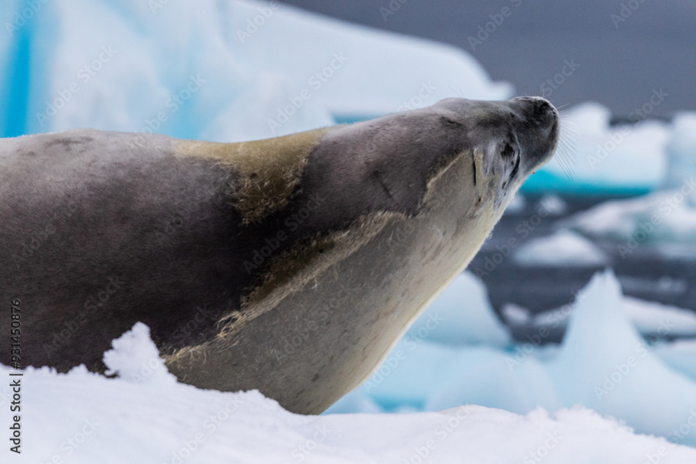 Close-up of a crabeater seal -Lobodon carcinophaga- resting on a small iceberg near the fish islands on the Antarctic peninsula