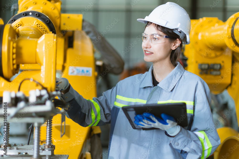 Engineer woman working in advance machine factory. Female worker engineering staff work checking robot arm in assembly plant with tablet