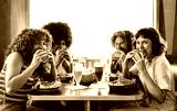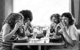 Multiethnic group of friends having meal at 80s vintage diner restaurant - Multiracial young people bonding and having fun, eating in an american fast food burger house