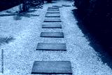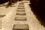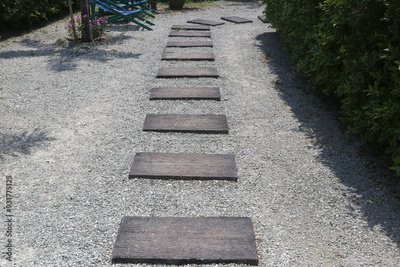 Walkway with wooden pattern stone slabs is placed in the backyard.