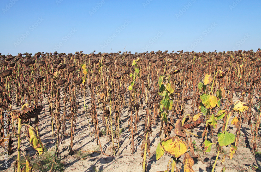 Ripe, dry, autumn sunflowers. Technical, agricultural, oilseed crop. Nice sunflower field on the blue sky background. Harvest and fodder for livestock. Drought summer and sunflowers with heads down