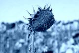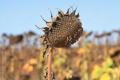 Single sunflower head with seeds in autumn farm field. Ripe and dry sunflower. Technical, agricultural, oilseed crop. Harvest and fodder for livestock. Droughty fall and sunflower with head down