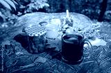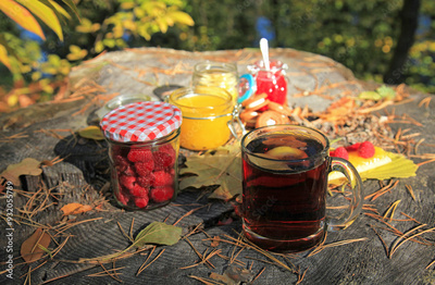 Autumn time and tourism. Still life in forest. Honey breakfast in the fall forest. Black tea, honey and raspberries on the edge of the old tree stump. Autumn weekend, outdoor. Picnic, outing concept