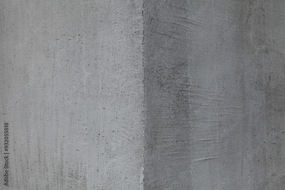 Grey wall texture, background. Concrete plaster surface. The corner of a wall or building. Smooth and flat cement plaster on the corner of the building. Screed coating in construction close-up