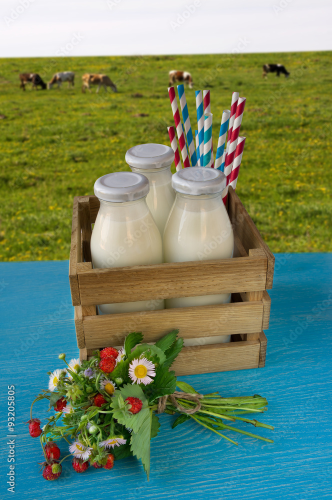 Milk bottles arranged in rows on a wooden table